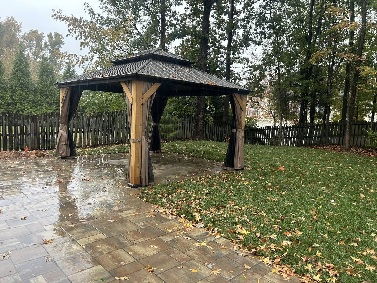 To soften the hardscape and frame the new patio, the project included the installation of plenty of rich topsoil followed by lush Fescue grass sod. This instant green carpet provides a striking contrast to the stone and offers a cool, soft area for play and pets. To cap off the functionality of the space, the team constructed a customer-purchased Gazebo. By having professionals assemble and anchor this structure, the homeowners gained an immediate, shaded destination for dining and relaxation. This holistic approach—combining demolition, technical grading, premium hardscape installation, softscape revitalization, and vertical construction—resulted in a cohesive and stunning outdoor environment. It’s a clear demonstration of how a multi-faceted project, executed with care and expertise, succeeds in Making Homes More Beautiful®, turning a simple backyard into a grand retreat.