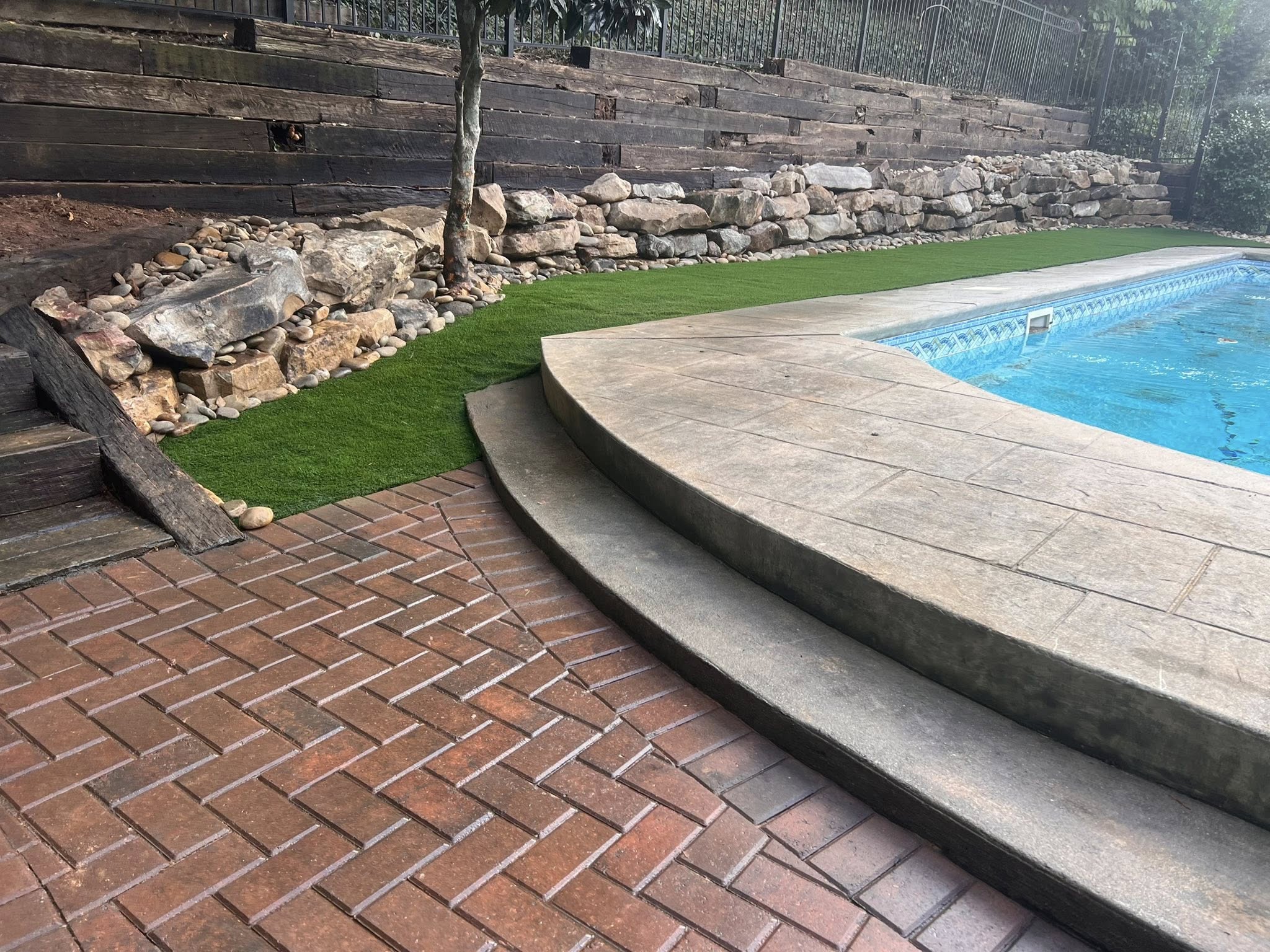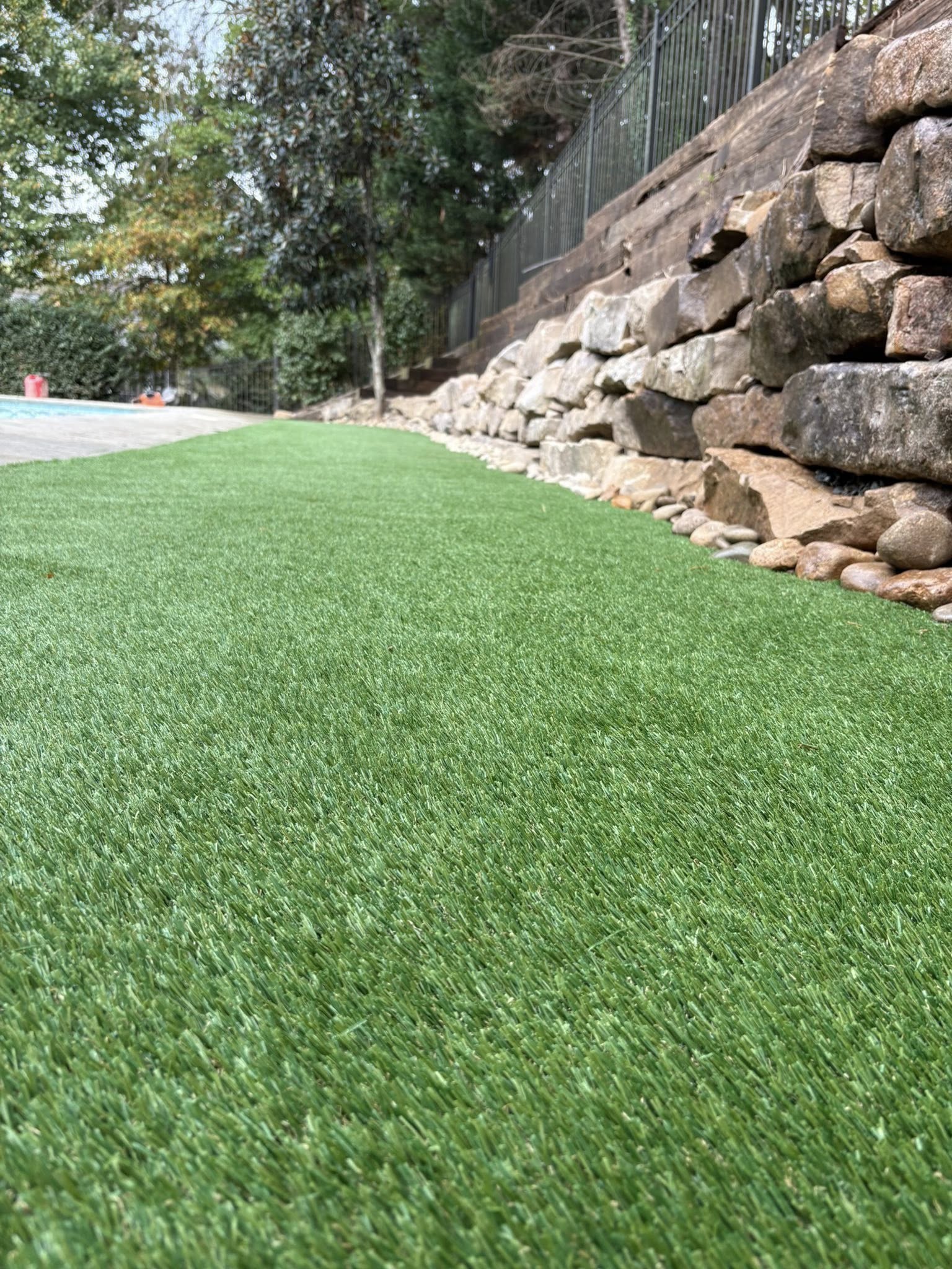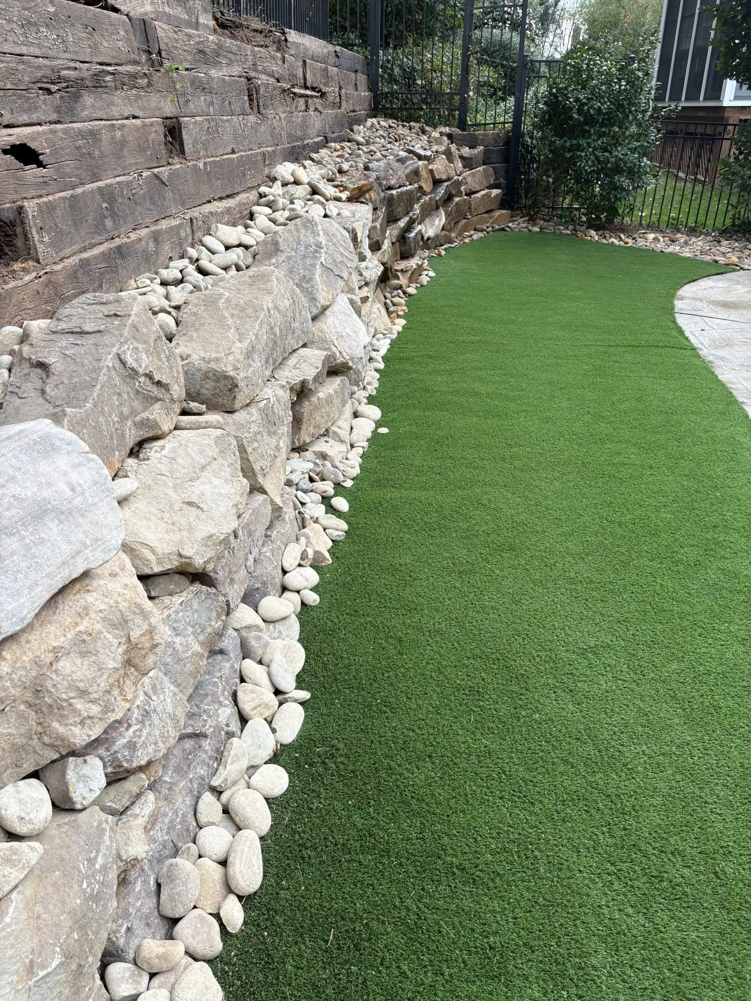 Connecting these natural and synthetic elements is a spacious Paver Patio, providing the essential hardscape foundation for relaxation and entertainment. This durable surface offers a level, stylish platform for outdoor furniture, allowing the homeowners to sit back and admire the surrounding landscape. To complete the scene, beds of smooth River Rock act as a functional accent, aiding in drainage and adding another layer of texture that softens the transition between the hardscape and the boulder wall. The synergy of these four distinct components—the structural finger boulders, the soft artificial turf, the functional pavers, and the decorative river rock—results in a cohesive, low-maintenance sanctuary. This project exemplifies how diverse materials can be harmonized to elevate a property, perfectly embodying the mission of Making Homes More Beautiful® by turning a standard backyard into a stunning, multi-textured retreat.