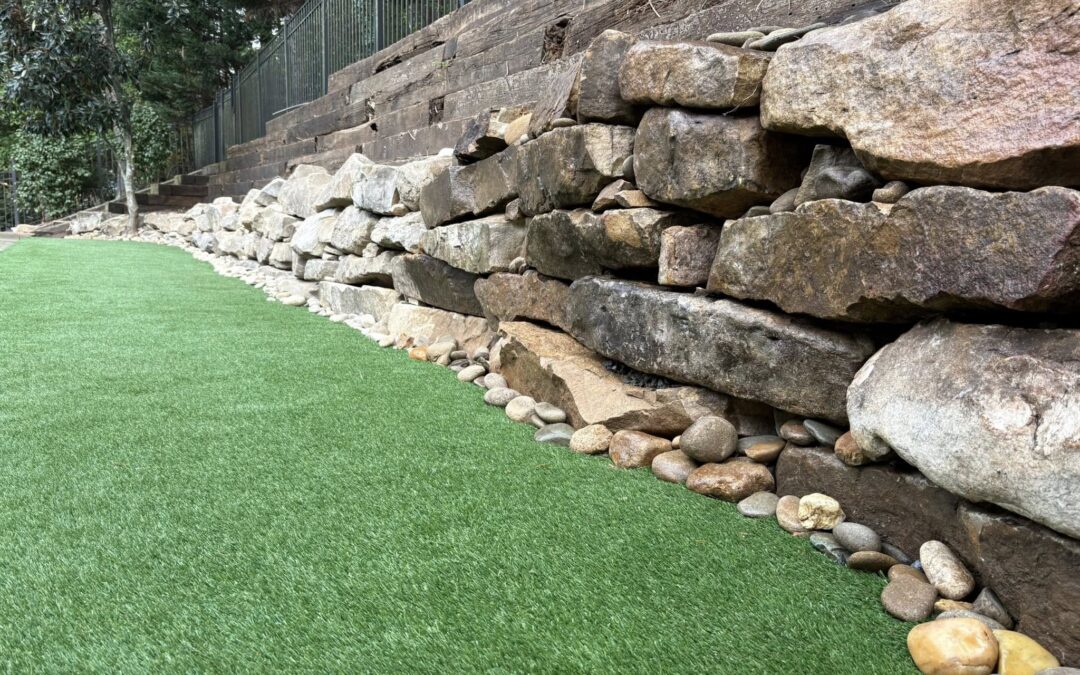 Surrounding this striking stone feature, a carefully curated selection of modern elements comes together to make for an amazing outdoor living space. The integration of pristine Artificial Turf provides a vibrant, evergreen counterpoint to the grey tones of the boulder wall. This synthetic lawn ensures a lush, manicured look year-round without the maintenance challenges of mowing or watering in the shade of Thornhill’s mature trees. It creates a clean, mud-free zone perfect for pets and play, staying impeccable regardless of the season.