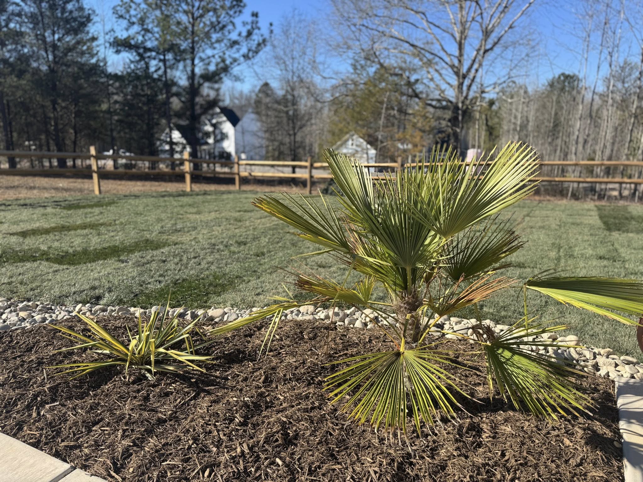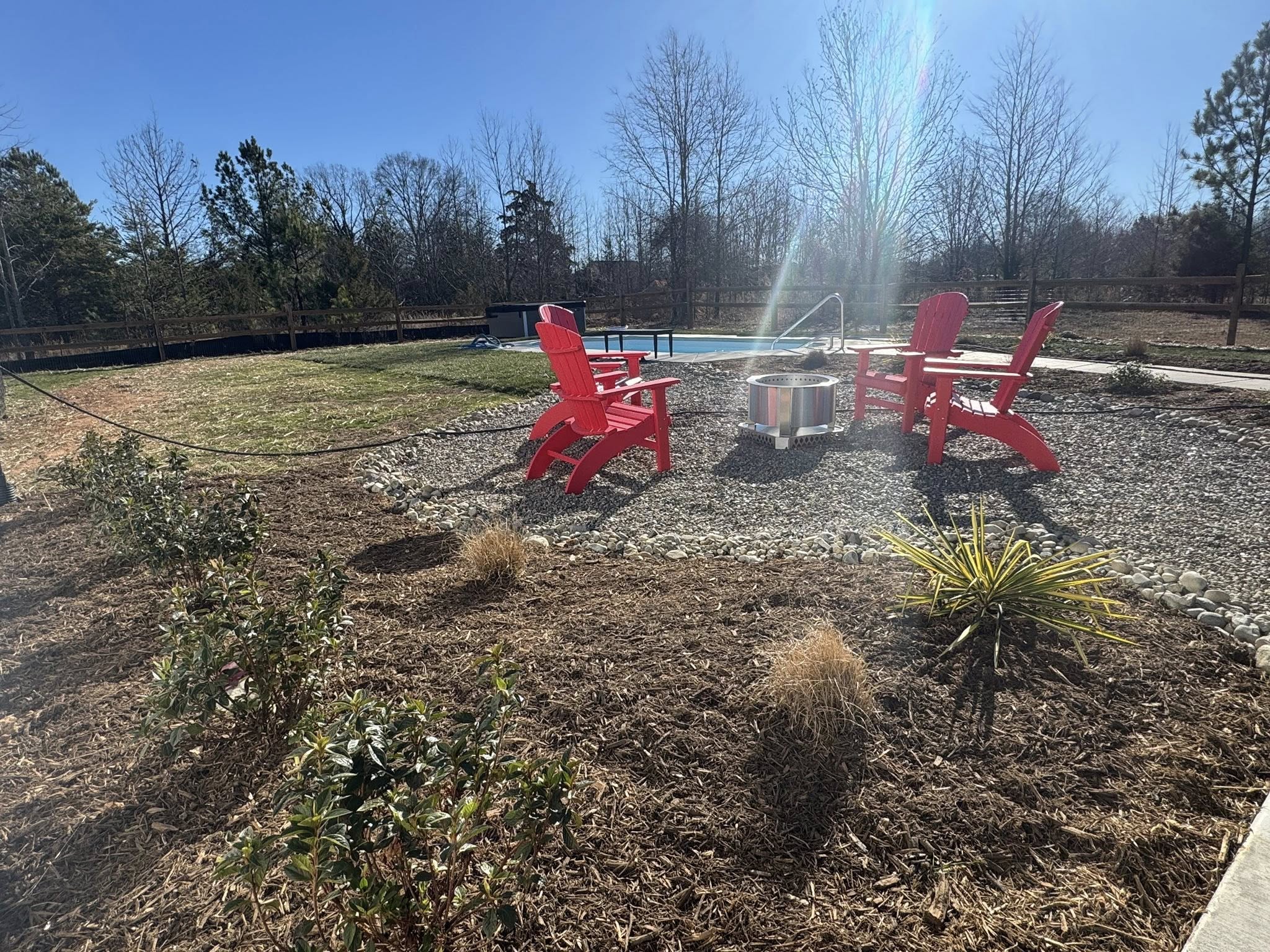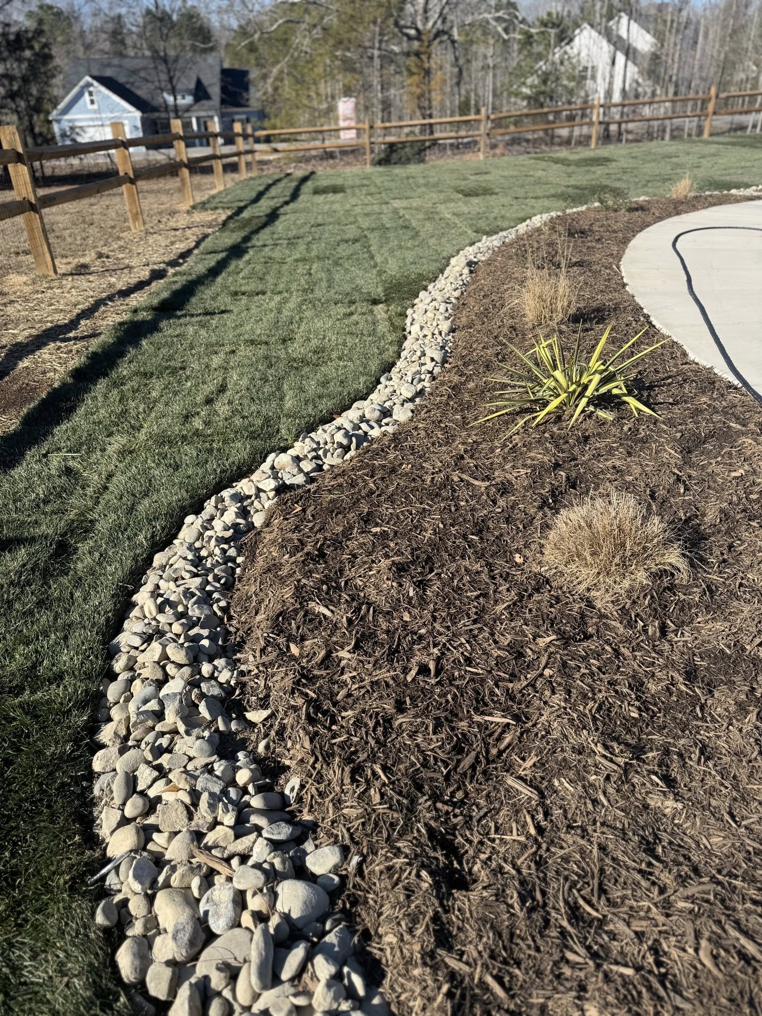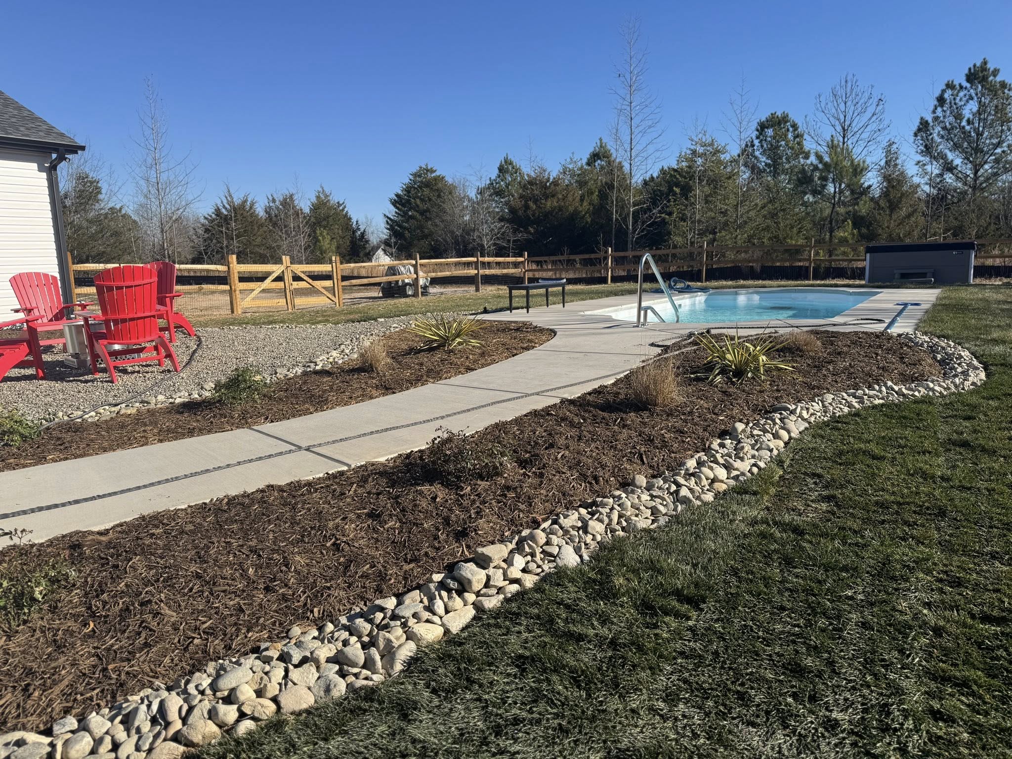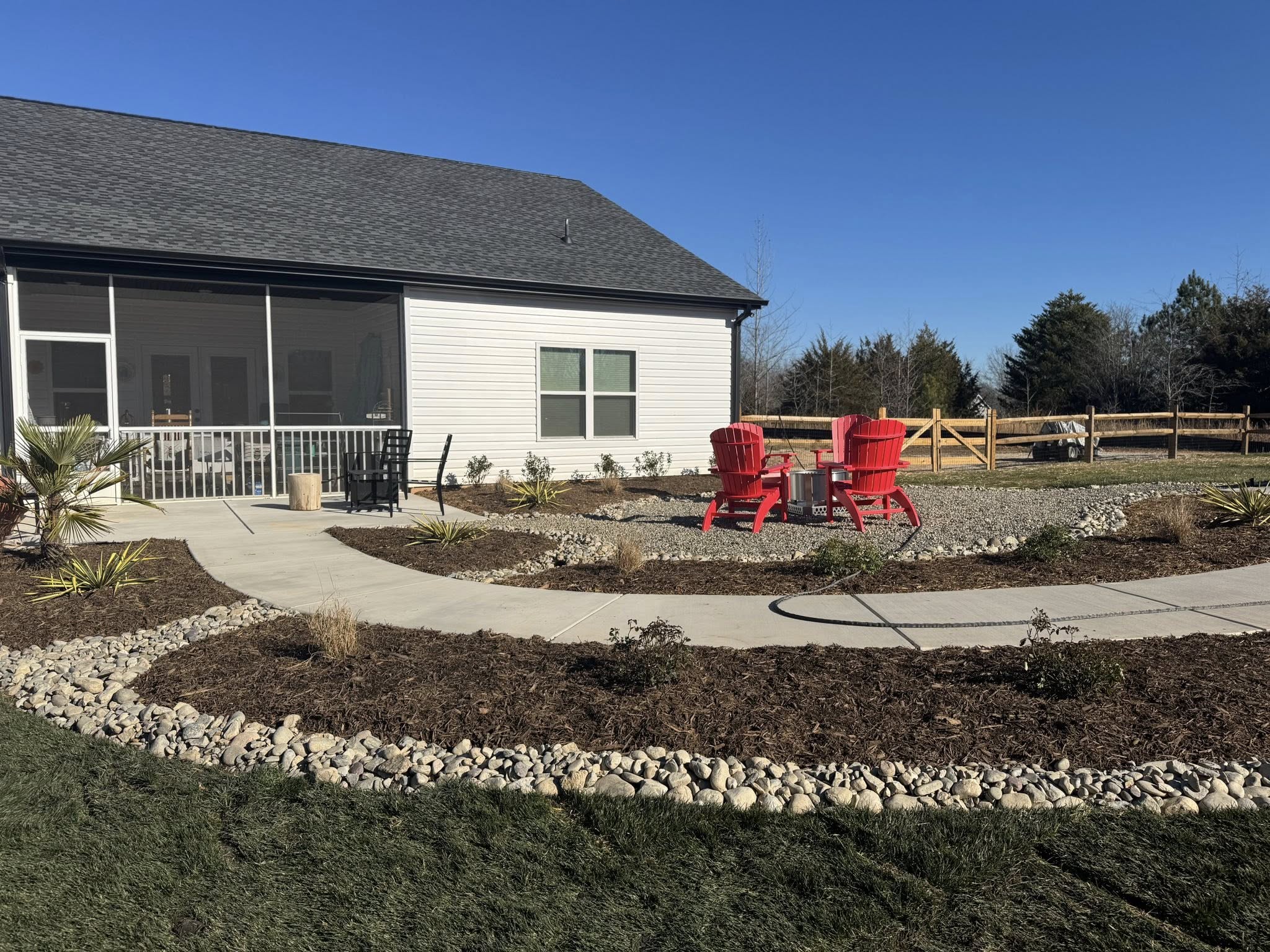 In this specific project, the dryscape is not merely a background element; it is the star of the show. Complete with a balance of professional Landscaping in Clover, SC the Dryscape is the headliner with Pea Gravel, River Rock and more. The design utilizes distinct textures to create visual interest. Pea gravel, with its small, smooth stones, is used for the primary foot traffic areas. It provides a satisfying, permeable surface that crunches pleasantly underfoot and stays cool in the summer heat. In contrast, larger River Rock is often employed as a border or a functional drainage solution. In the heavy clay soil common to Clover and the surrounding region, river rock beds act as excellent channels for stormwater, preventing erosion and keeping the yard dry and accessible.