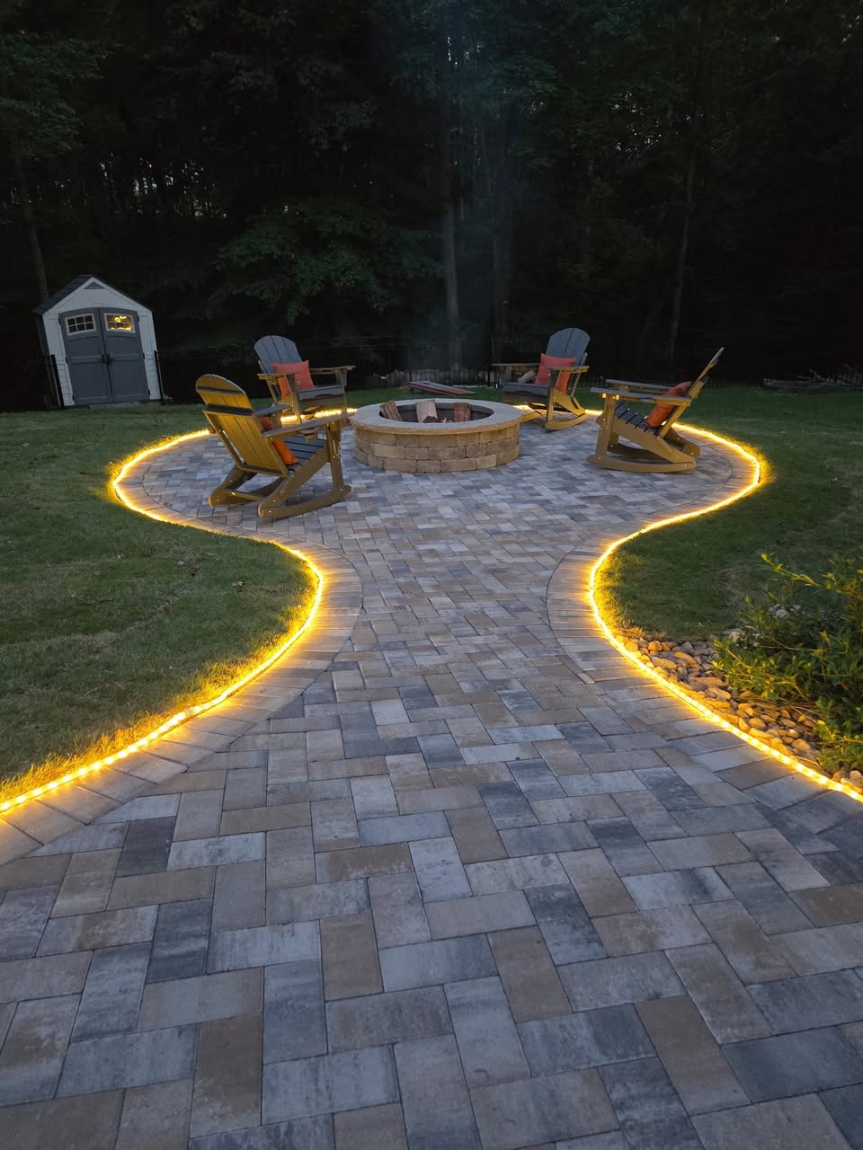 This project is a perfect example of the synergy between a professional installation and a homeowner’s personal style. The hardscape provides the permanent value and functionality, while the lighting adds the personality. The combination of the crackling fire, the solid patio, and the overhead canopy of light creates the perfect setting for this family and their dog to unwind, connect, and make lasting memories.