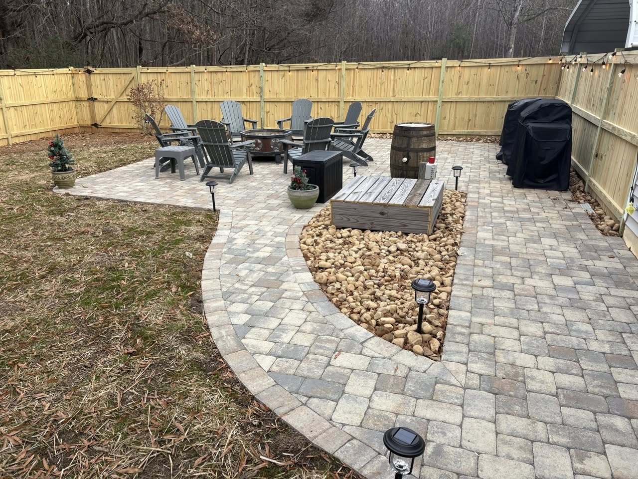 The foundation of this transformation was practical engineering. Before the aesthetic elements could be enjoyed, serious site work was required. Grading (new lawn) and Drainage Solutions were implemented to manage the notorious North Carolina red clay and stormwater runoff. By correcting the slope and installing proper water management systems, we ensured that the new yard would remain dry and usable, rather than becoming a muddy bog after every rainstorm. This technical groundwork paved the way for the Paver Patio, a durable and elegant hardscape that serves as the floor plan for their new outdoor room. Surrounding this area, a custom Wood Privacy Fence was installed, providing the seclusion necessary to truly relax and disconnect from the outside world.