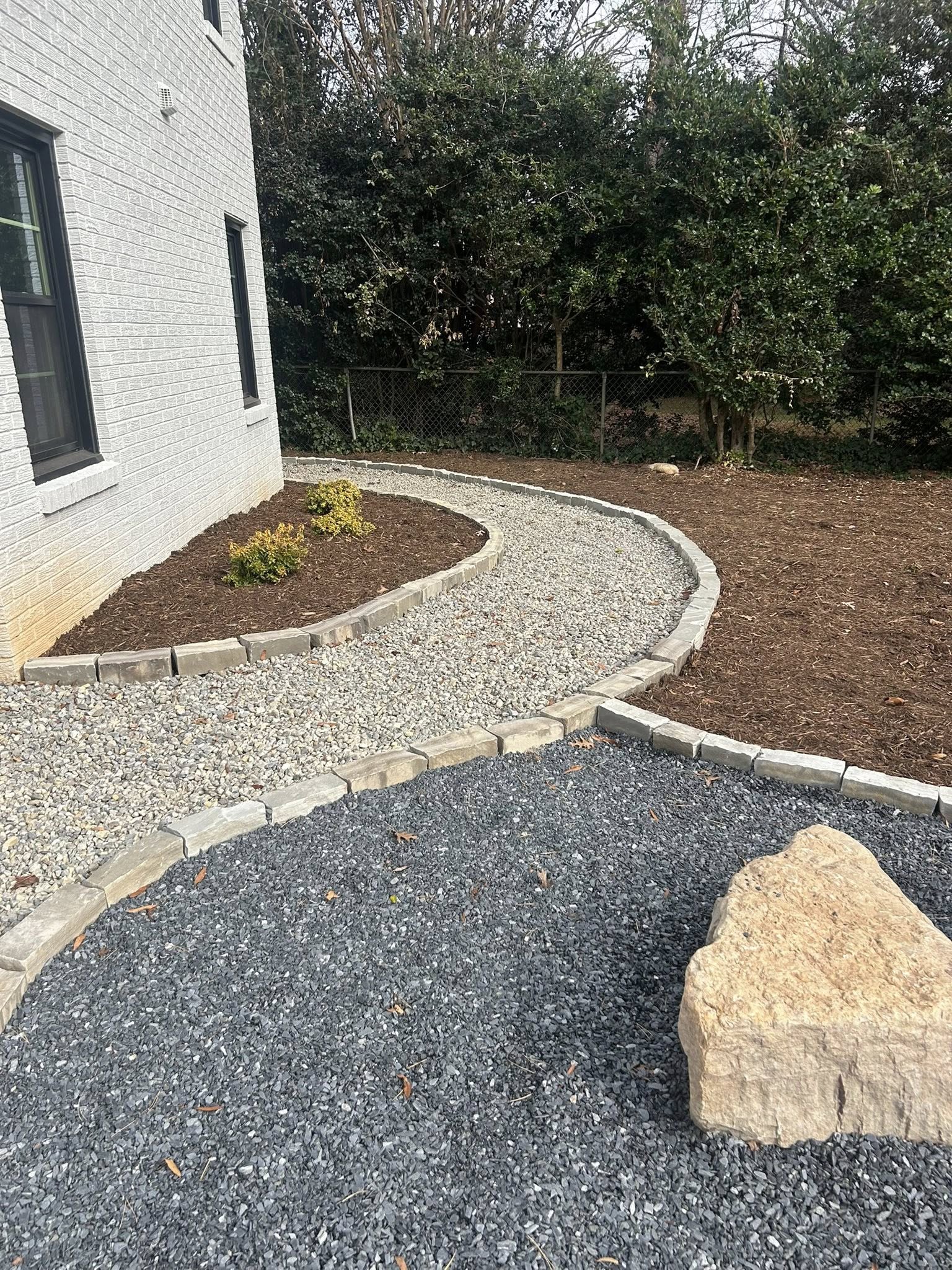 However, the success of a loose-aggregate feature lies in its containment. Without a proper border, gravel can migrate into lawn areas or flower beds, creating a maintenance headache. To solve this, using natural stone cobblestone as Curbing to enclose the Pea Gravel Pathway was the perfect design choice. These cobblestones provide a robust, structural edge that holds the gravel firmly in place while adding a rustic, old-world aesthetic. The rugged texture of the stone curbing contrasts beautifully with the smooth, small river pebbles of the pathway, creating a defined yet soft boundary that guides the eye through the garden.